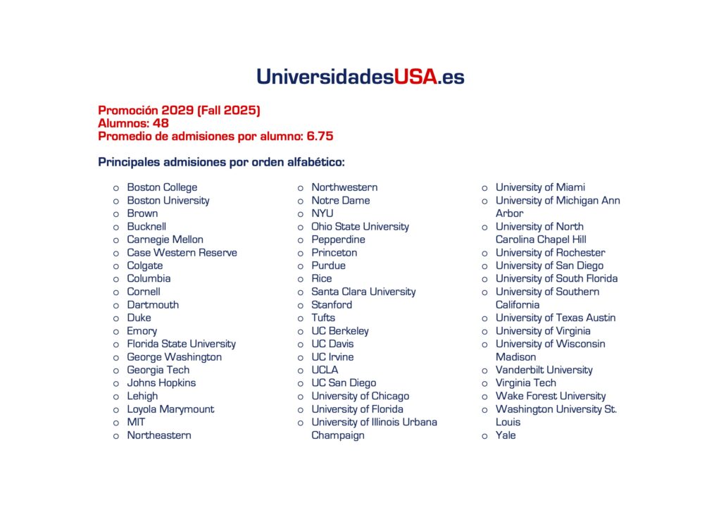 Lista de admisiones UniversidadesUSA.es Promoción 2029 (Fall 2025)